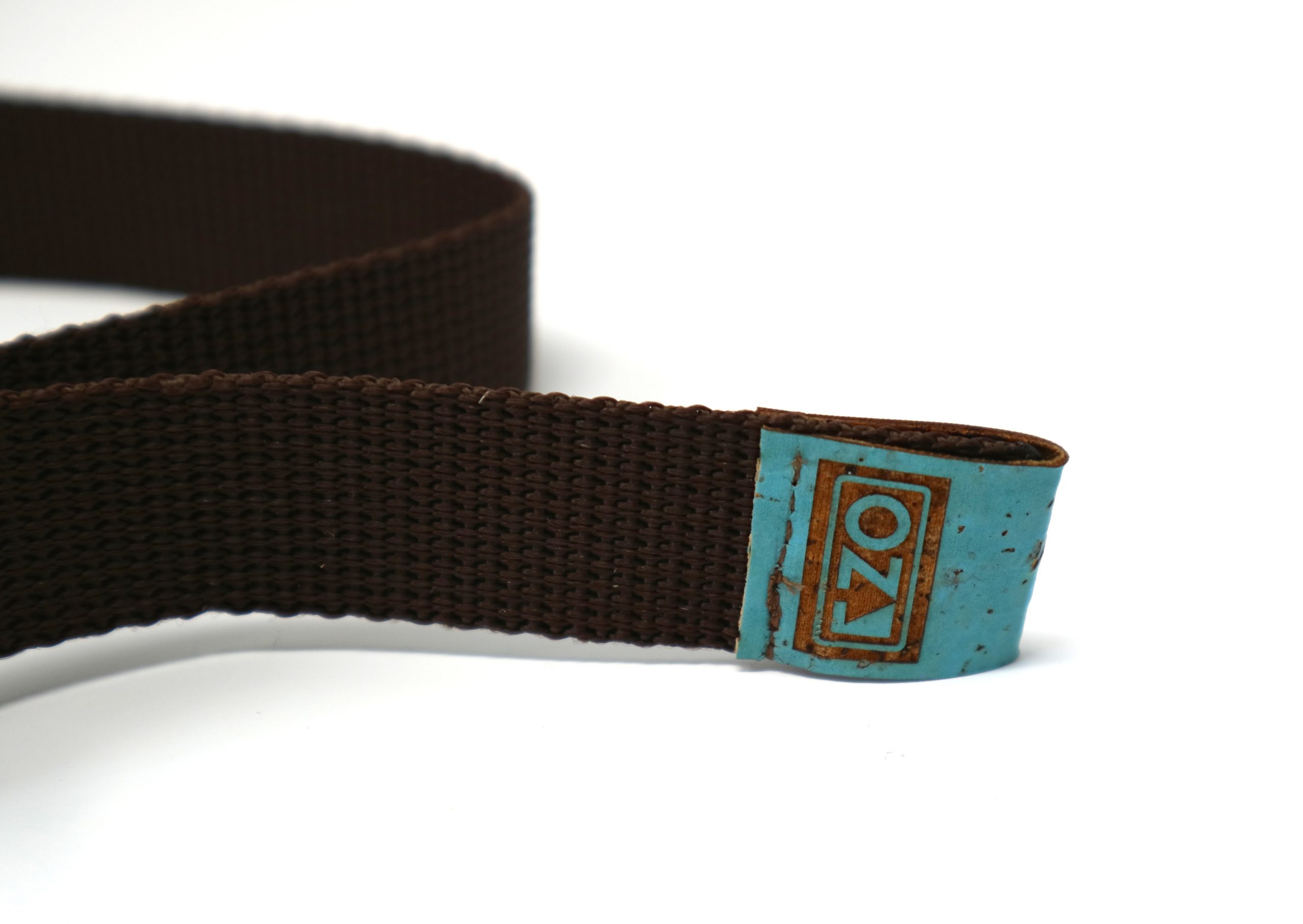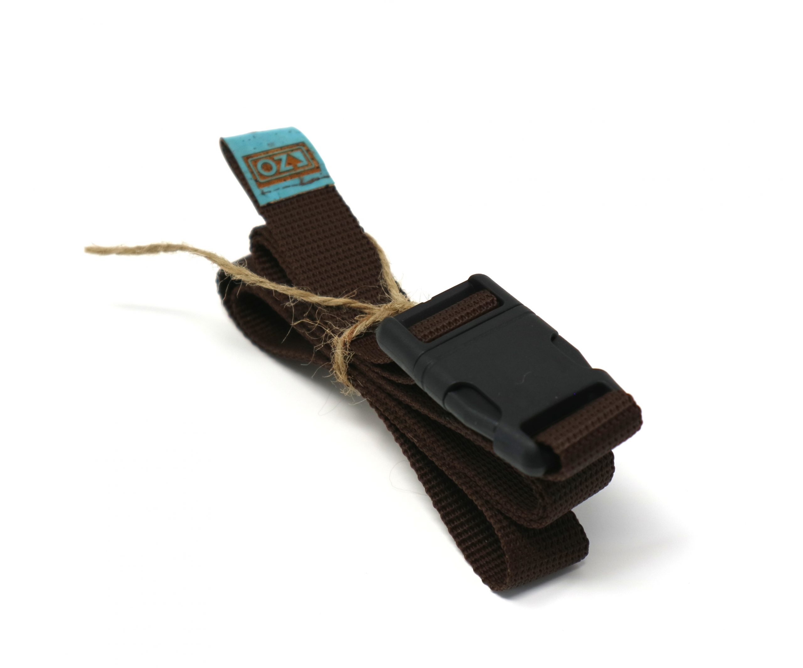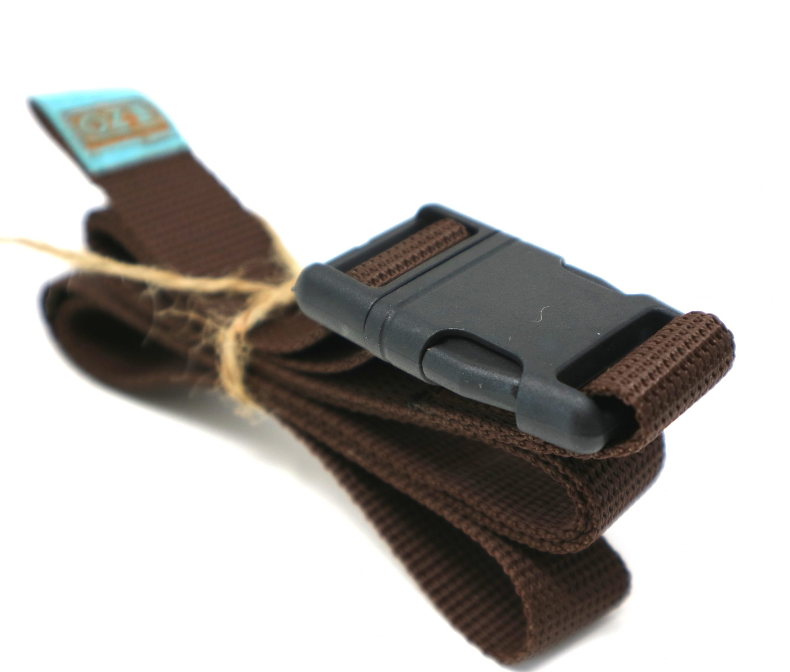 Notre ceinture en sangle marron faite main est pratique, facile à mettre sur votre sac à magnésie, facile à enlever et ajuster avec sa boucle clip, simple avec un logo en liège bleu!