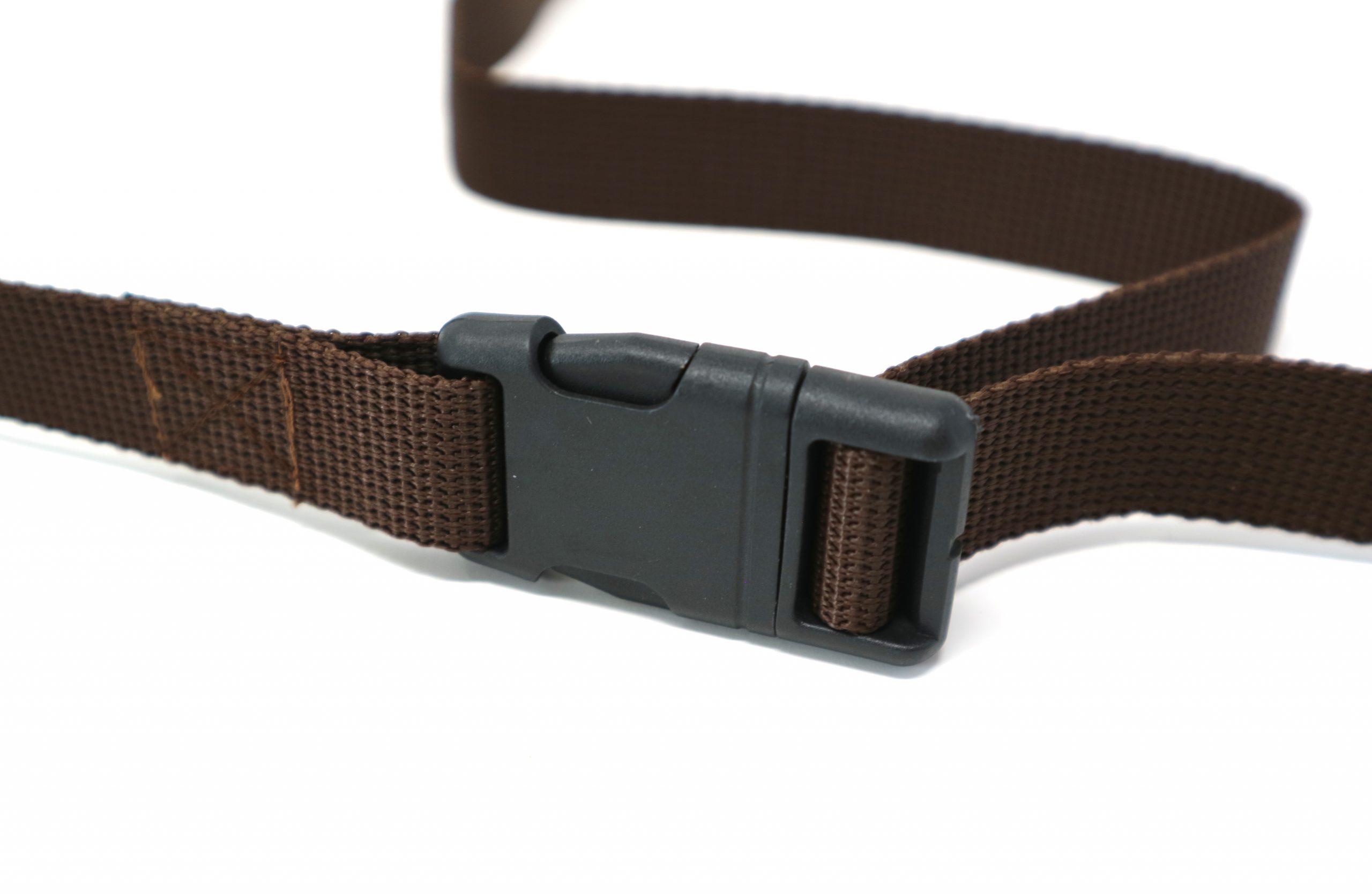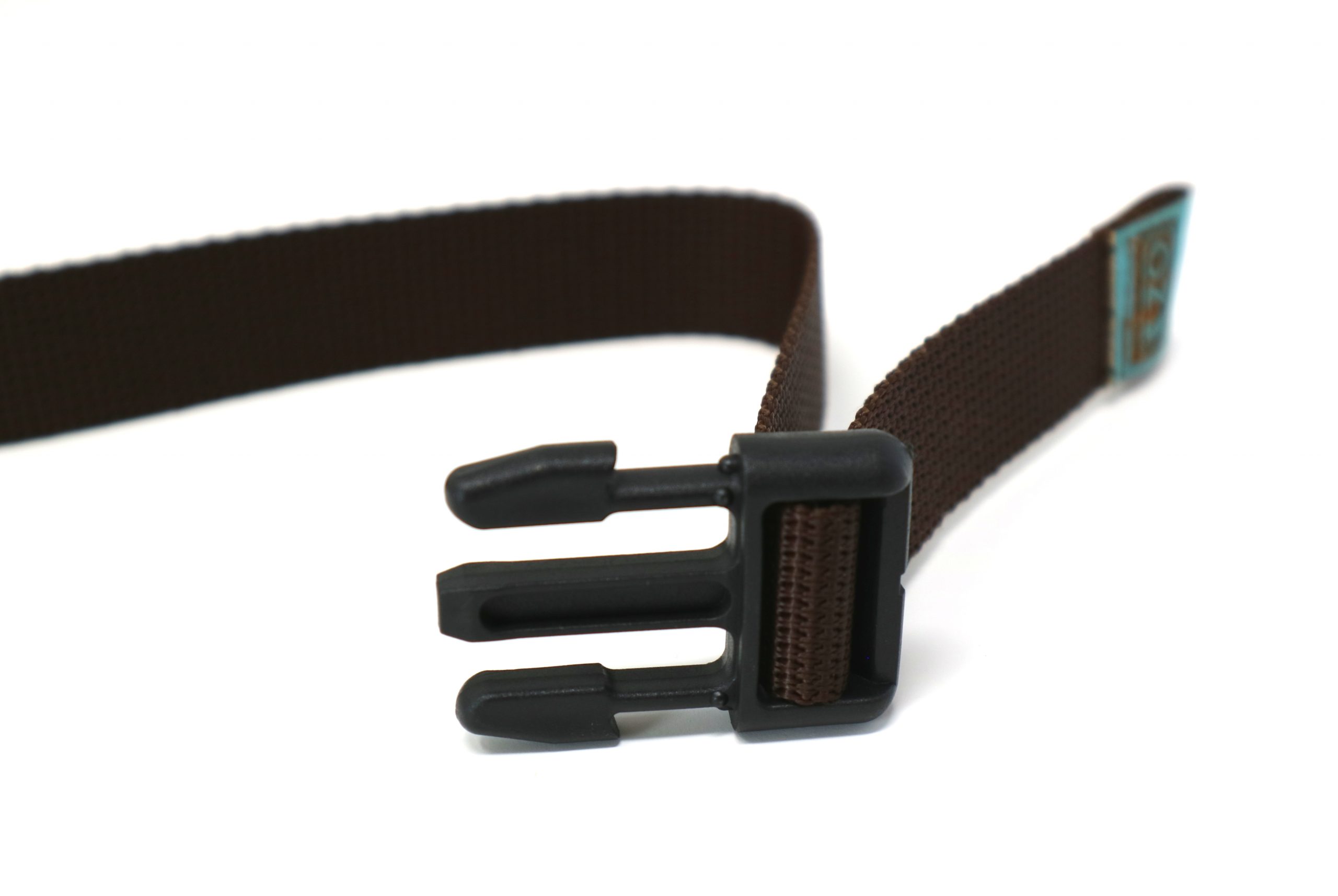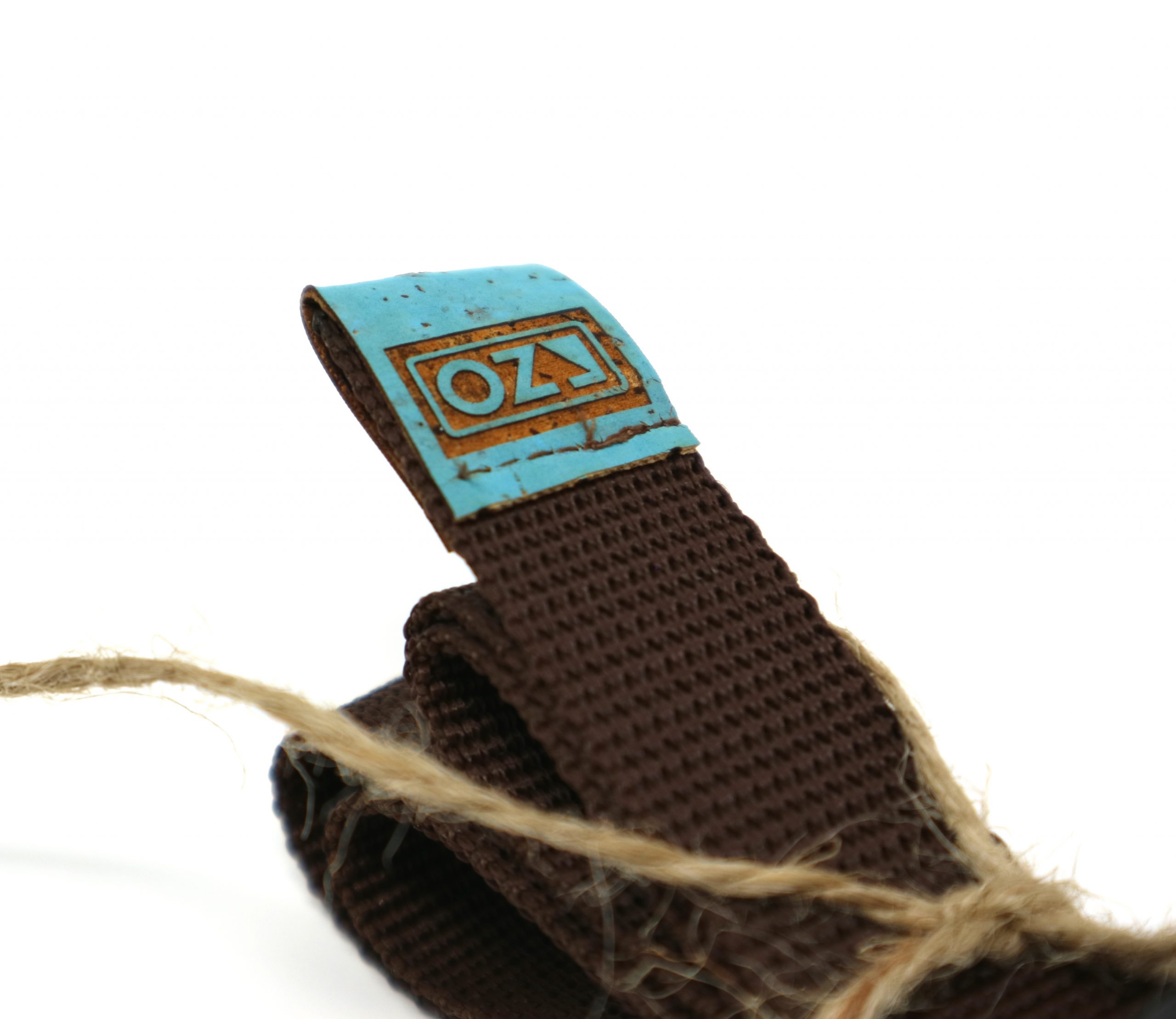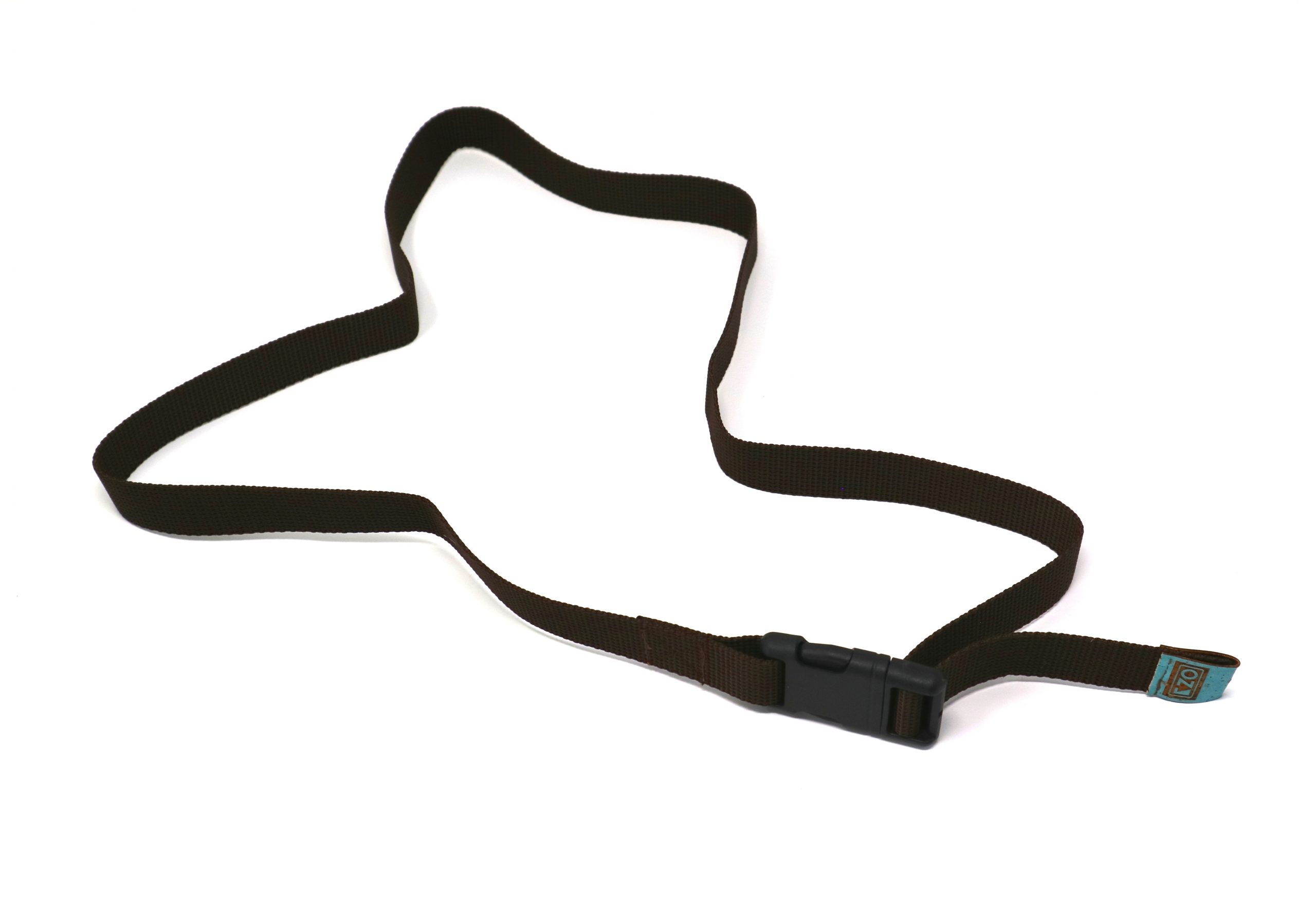 Notre ceinture en sangle marron faite main est pratique, facile à mettre sur votre sac à magnésie, facile à enlever et ajuster avec sa boucle clip, simple avec un logo en liège bleu!