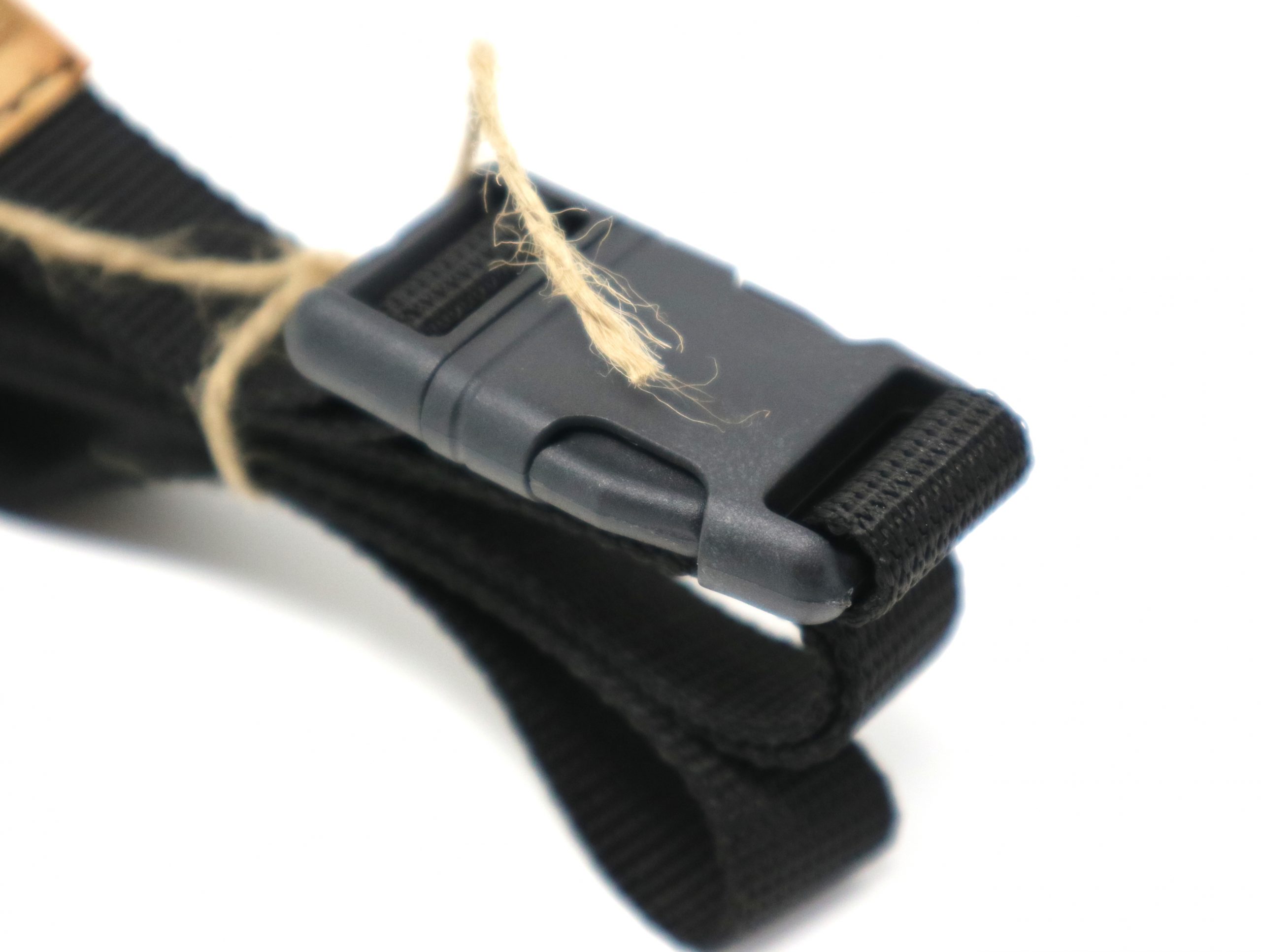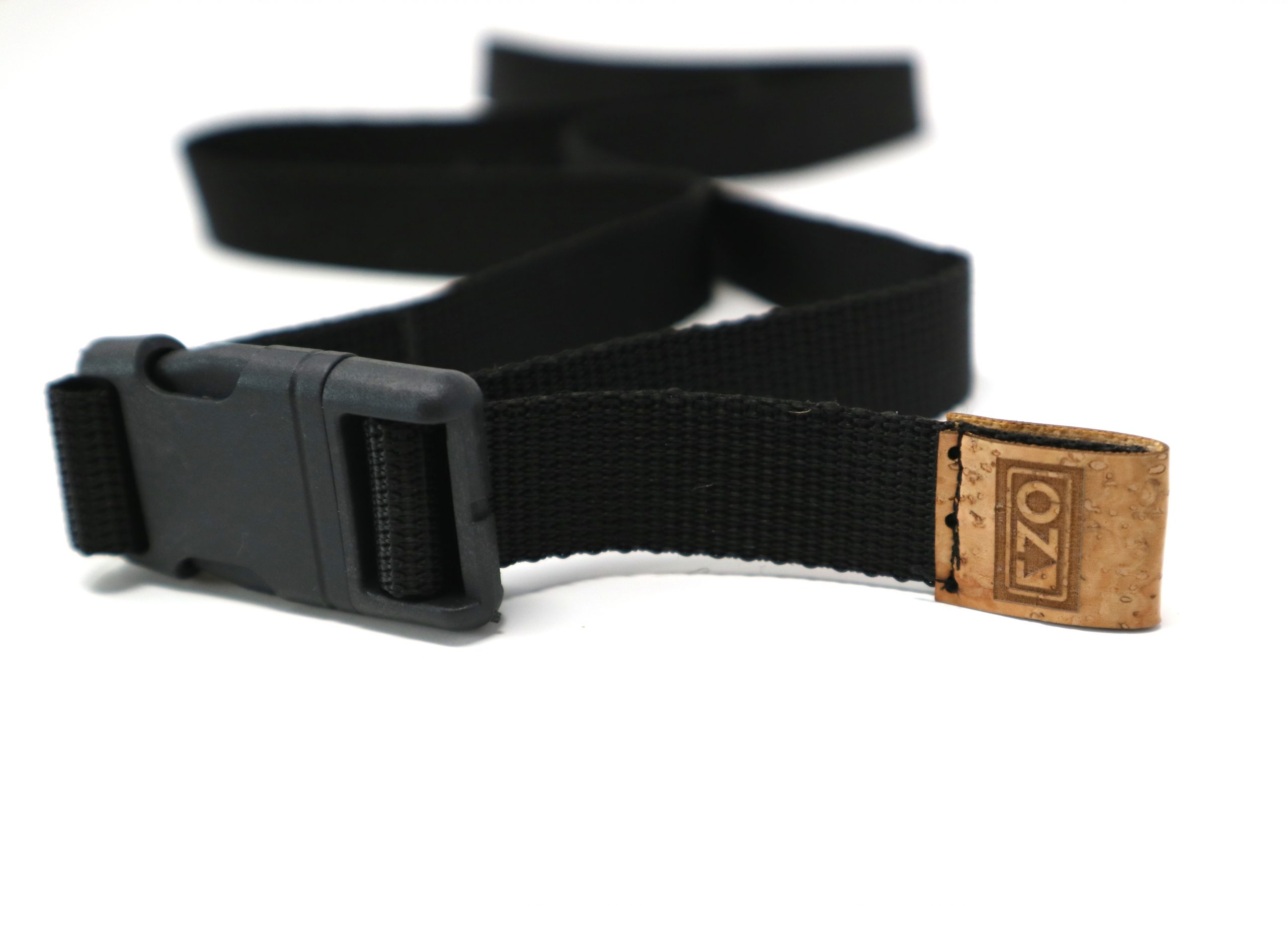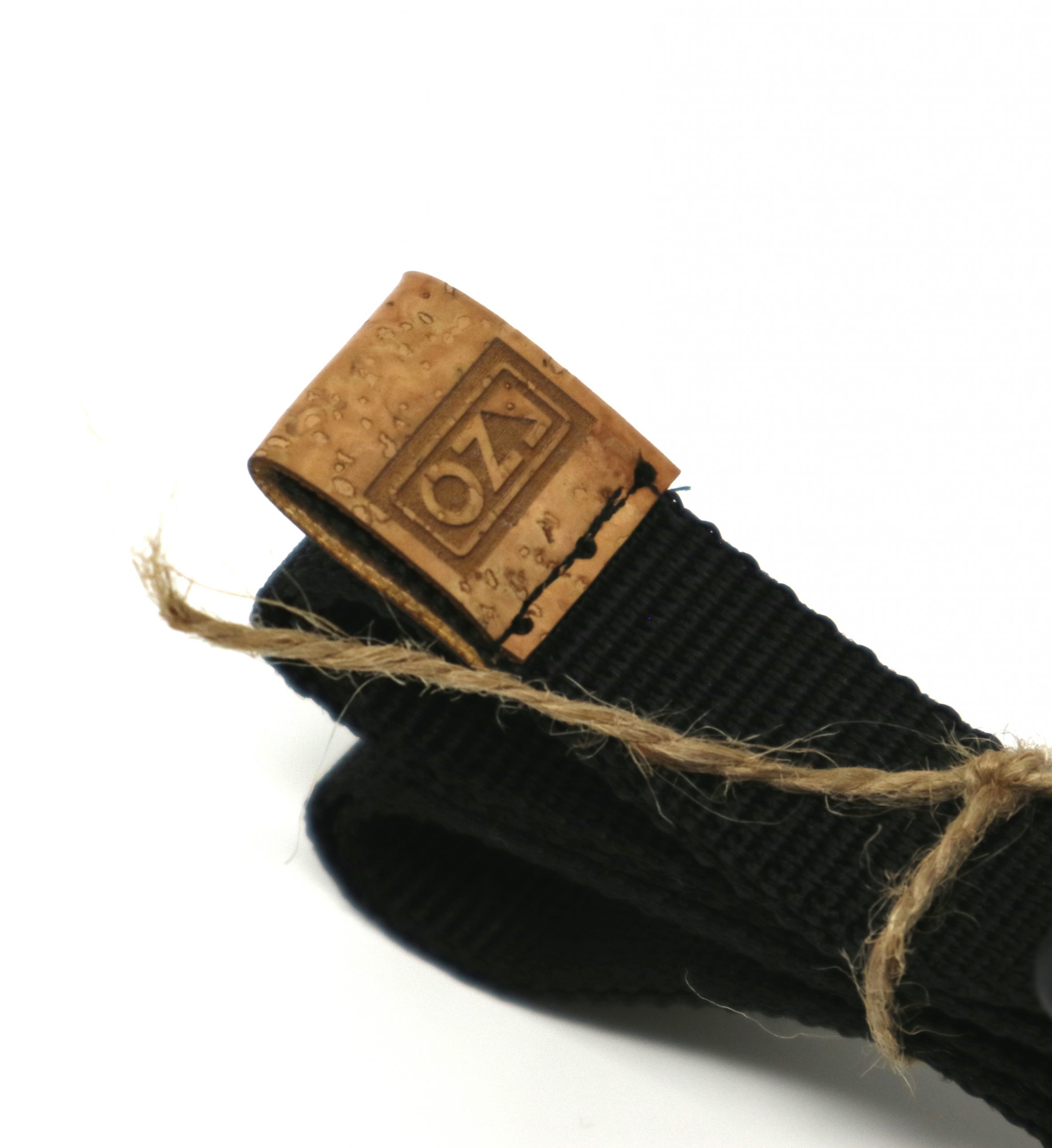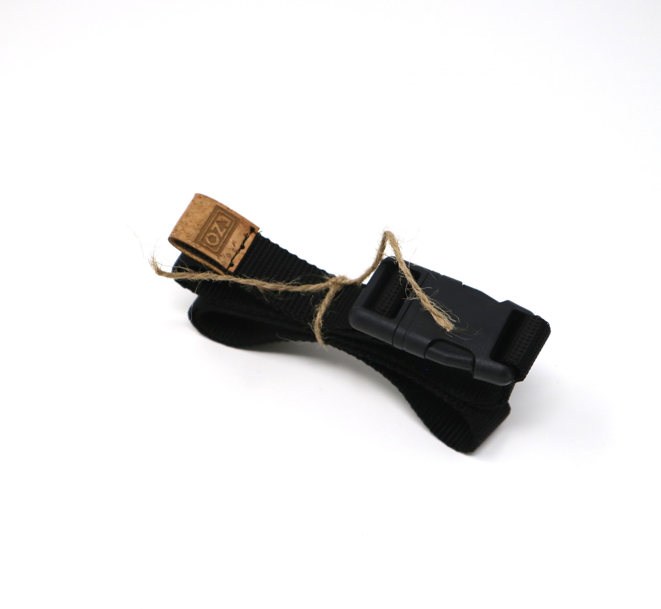 Notre ceinture en sangle noire faite main est pratique, facile à mettre sur votre sac à magnésie, facile à enlever et ajuster avec sa boucle clip, simple avec un logo en liège beige!